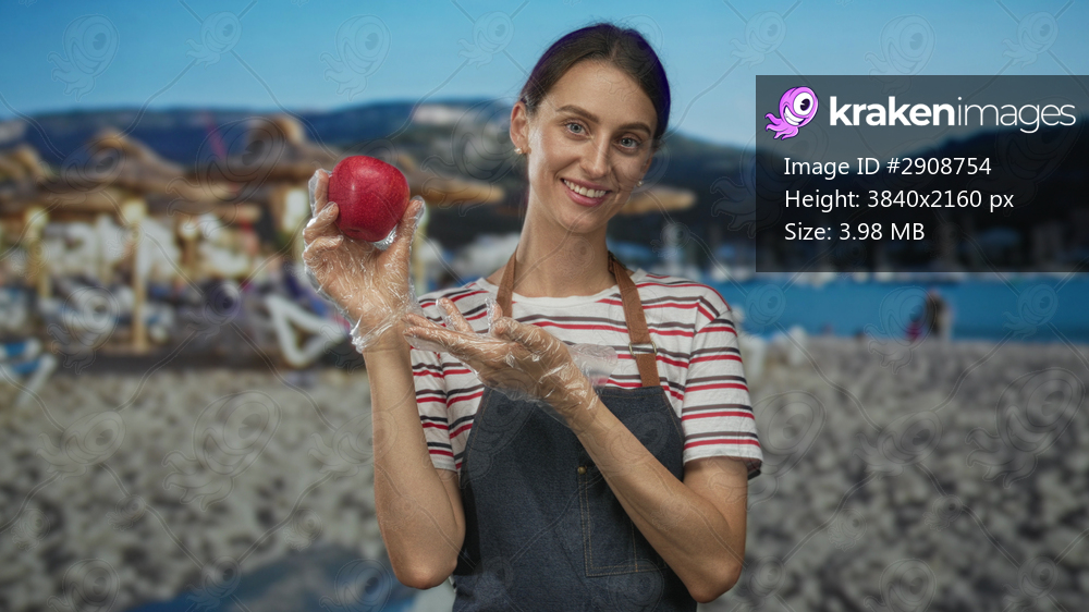 Woman holding a red apple with gloved hands at beach wearing apron and striped shirt, presenting fruit to camera; health nutrition happiness.