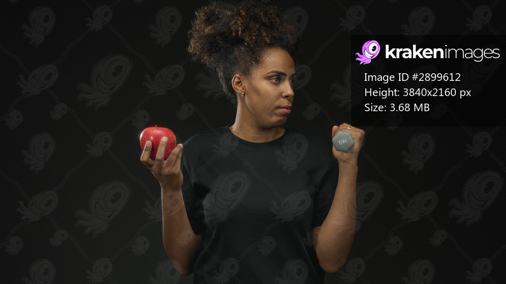 Woman holding a red apple in her left hand and a small 1kg dumbbell in her right hand in studio; contemplation healthy choice.