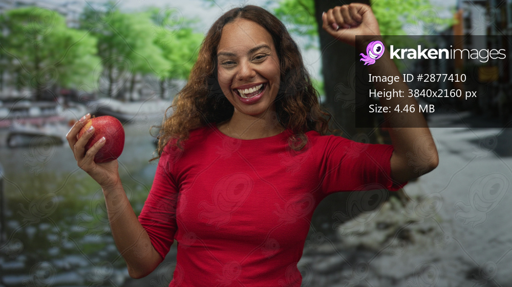 Woman holding a red apple, raises fist and smiles on a busy street in amsterdam canal district; happiness healthy eating celebration.