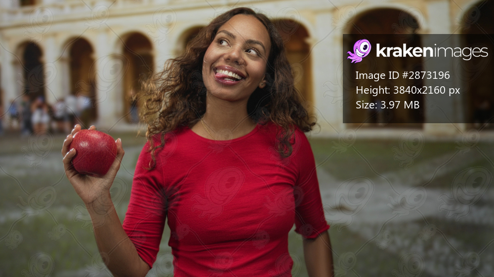 Woman holding a red apple and smiling with hand up in a building courtyard wearing a red top and necklace; playful confidence.