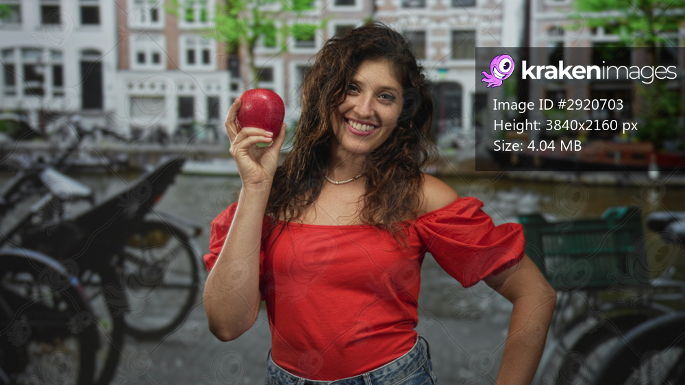 Woman holding a red apple and smiling on an amsterdam street near a canal with bicycles and a bench, wearing red off shoulder top and denim jeans; joy confidence. - Kraken Images