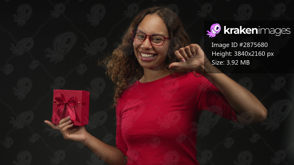 Woman holding a red gift box and giving a thumbs up gesture in studio with black backdrop; happiness celebration.
