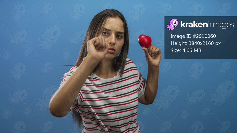 Woman holding a red heart in hand and making a small fist gesture while wearing striped shirt in studio blue backdrop; introspection healing.