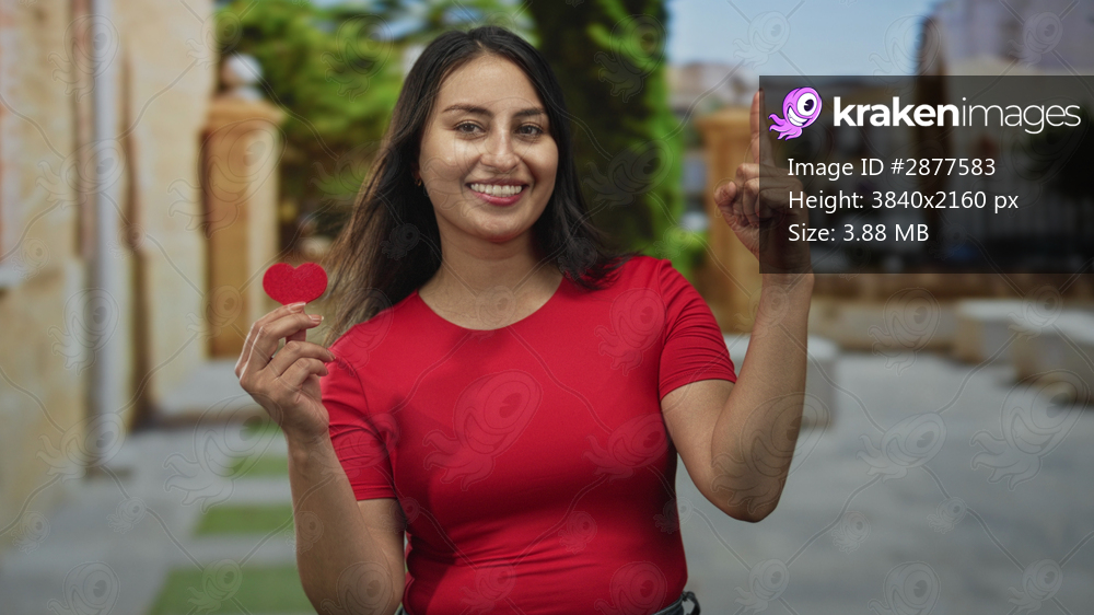 Woman holding a red heart in her hand and points index finger up on a sunny cobbled street with blurred buildings; happiness love awareness.