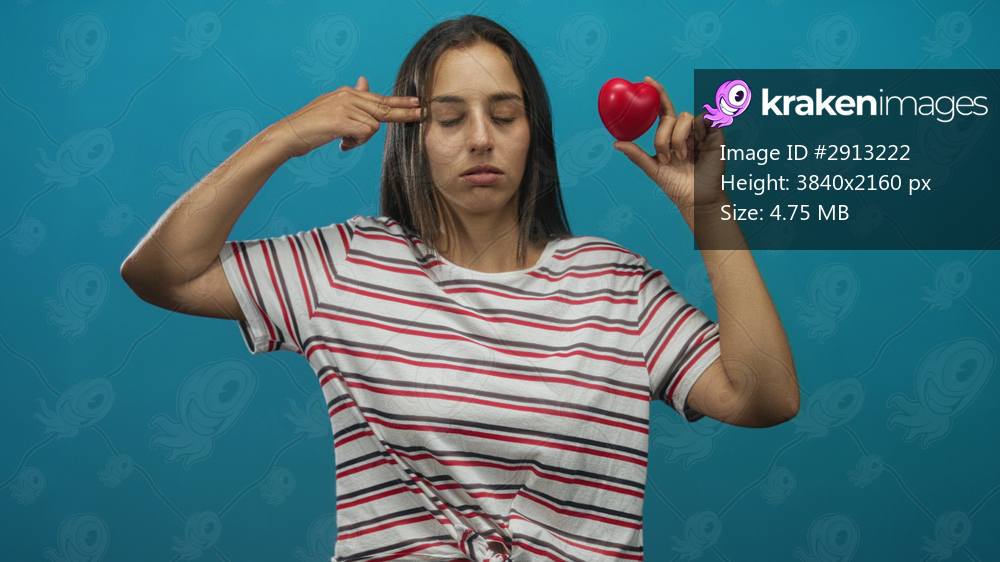 Woman holding a red heart and pointing finger to temple while wearing a striped shirt in blue studio; heartbreak frustration.