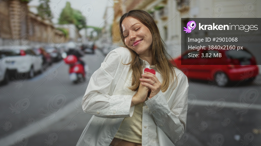 Woman holding a red heart toward camera on a city street while smiling and pointing heart to viewer; love joy.