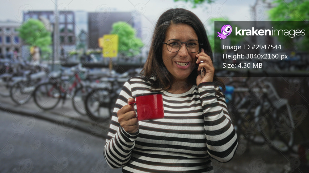 Woman holding a red mug and phone to her ear, smiling by rows of parked bicycles on a street; warmth joy connection.