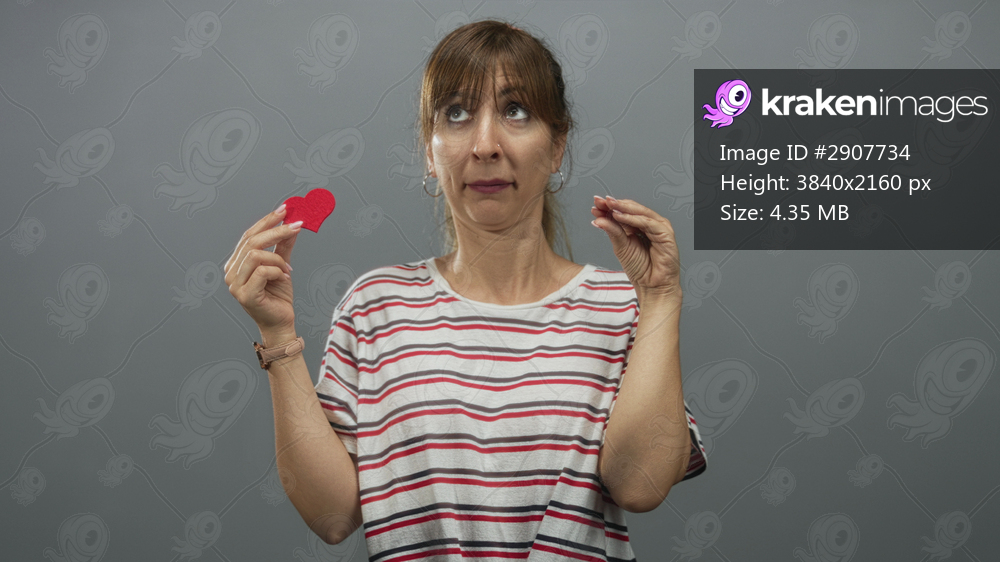 Woman holding a red paper heart with raised hand and expressive face in gray studio wearing striped shirt and hoop earrings; disgust rejection.
