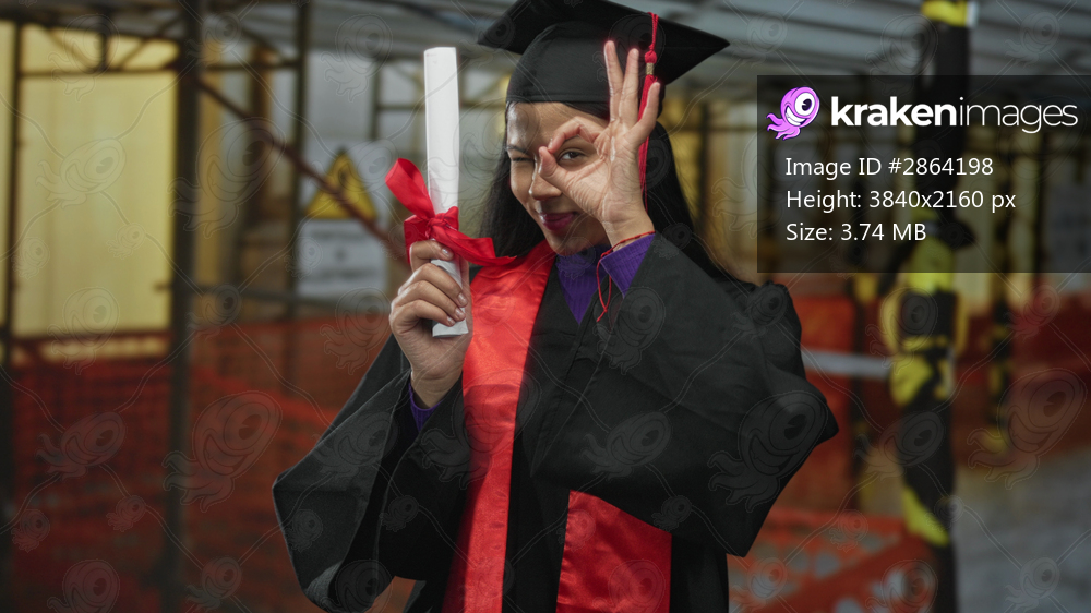 Woman holding a rolled diploma makes ok sign at a building site outdoors with visible scaffolding; achievement success celebration pride.