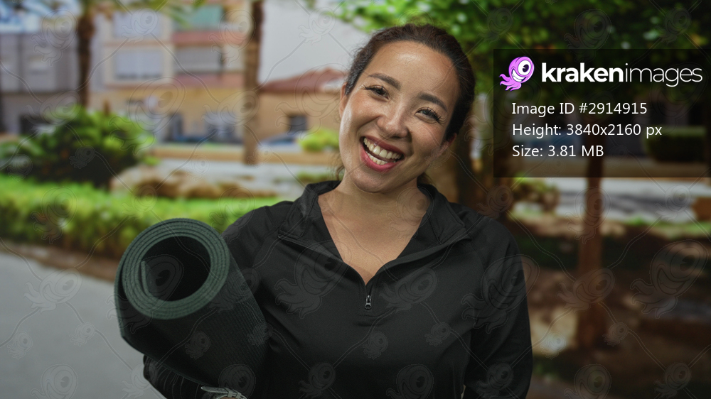 Woman holding a rolled yoga mat on a sunny street in front of residential buildings, smiling broadly while facing camera; joy wellness.
