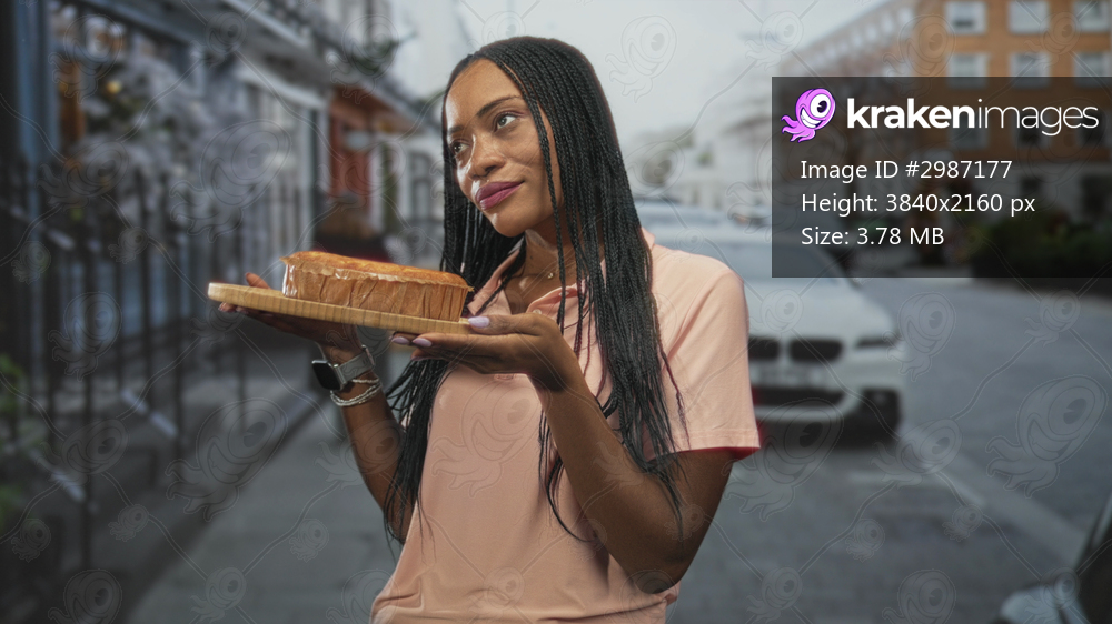 Woman holding a round pastry on her hands and presenting the cake with a smile on a city street; simple joy.