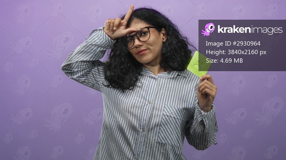 Woman holding a sad green sticky note and making an l gesture to forehead in purple studio; sarcasm self criticism.