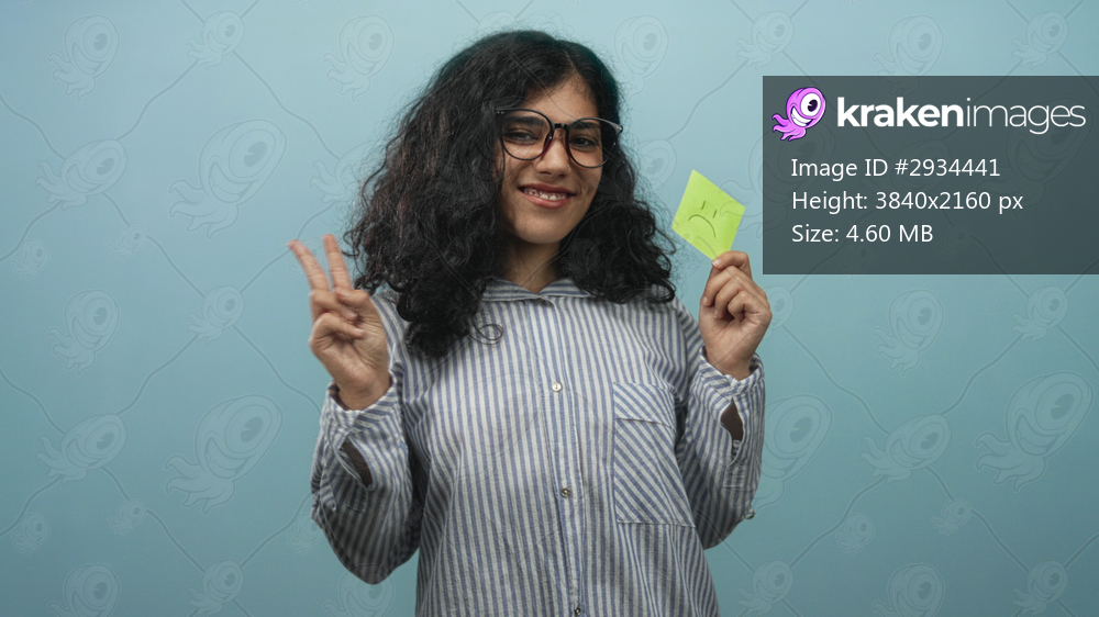 Woman holding a sad sticky note and flashing a peace sign in a light blue studio with striped shirt and glasses; playful irony.