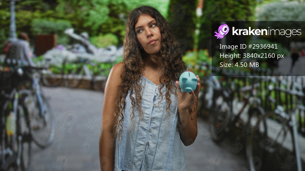Woman holding a small blue piggy bank with a pensive expression and relaxed arm on a street lined with parked bicycles and trees; contemplation.