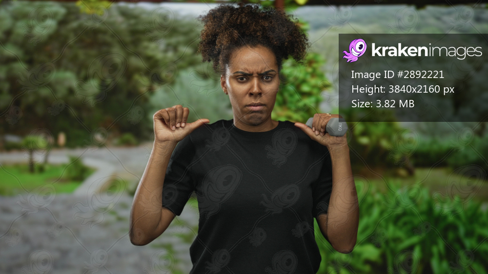 Woman holding a small dumbbell and pointing both thumbs to her chest on a forest path while frowning and tensing shoulders; frustration self doubt.