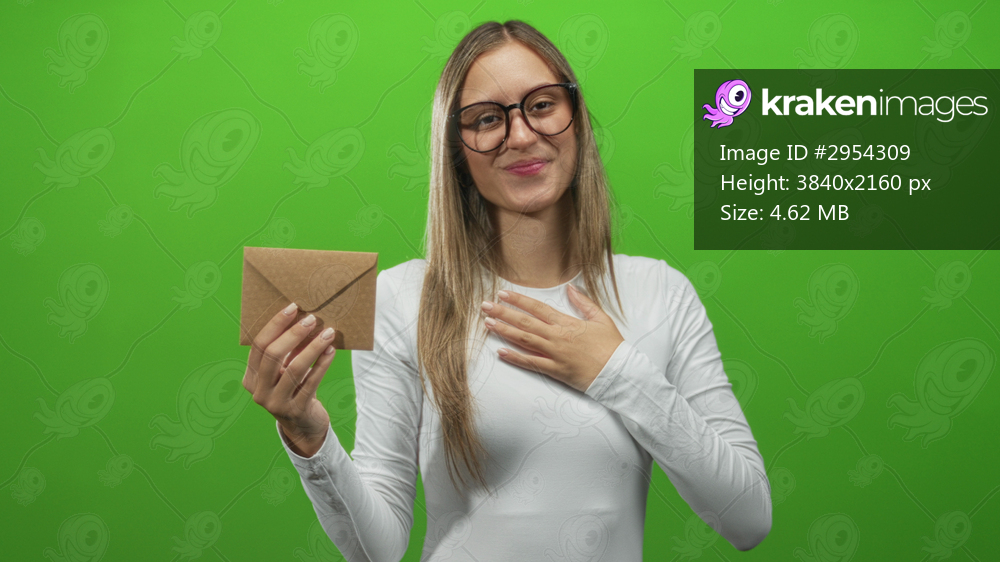 Woman holding a small envelope, hand over chest and eyes closed in studio wearing glasses and white top; gratitude.