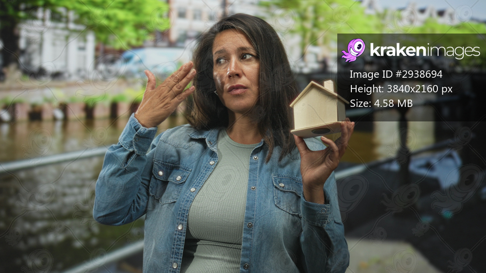 Woman holding a small wooden house model in hand and touching face as gesture on street; homeownership uncertainty concern.