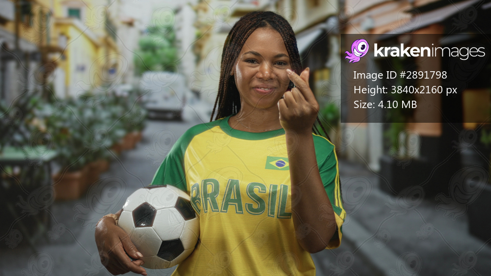 Woman holding a soccer ball and making a finger heart gesture on a narrow street with potted plants, wearing brazil jersey; team spirit joy.