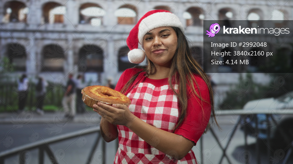 Woman holding a sponge cake and smiling while wearing a santa hat and apron in front of a historic building; festive joy.