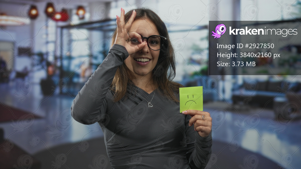 Woman holding a sticky note with a sad face and making ok sign to eye in a hotel building; playful contrast.