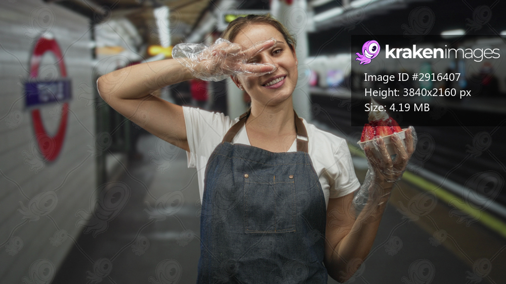 Woman holding a strawberry soft serve icecream in a plastic cup, wearing clear gloves and denim apron, making a peace sign to eye inside a station building; playful. - Kraken Images