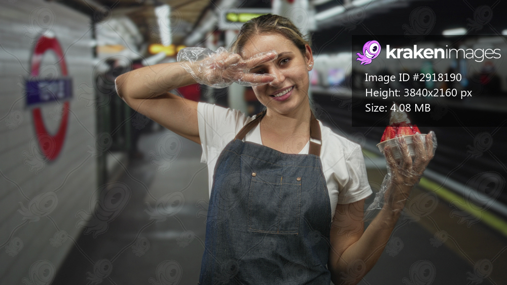 Woman holding a strawberry soft serve icecream in a plastic cup, wearing clear gloves and denim apron, making a peace sign to eye inside a station building; playful. - Kraken Images