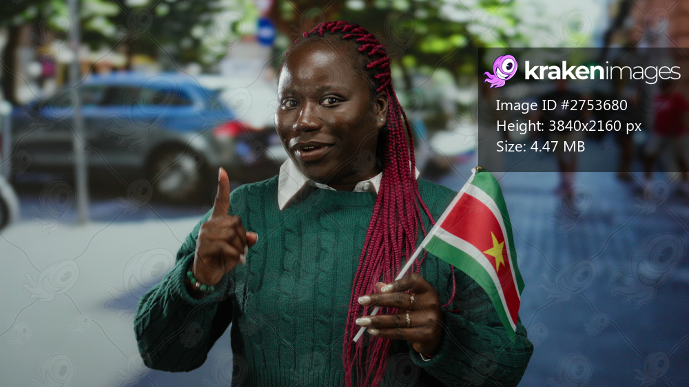 Woman holding a suriname flag smiles confidently on a vibrant city street, embracing her cultural pride in an outdoor urban setting.