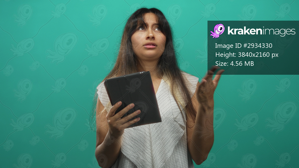 Woman holding a tablet with both hands while gesturing in a photo studio with a teal backdrop, looking puzzled and annoyed; frustration tech challenge. - Kraken Images