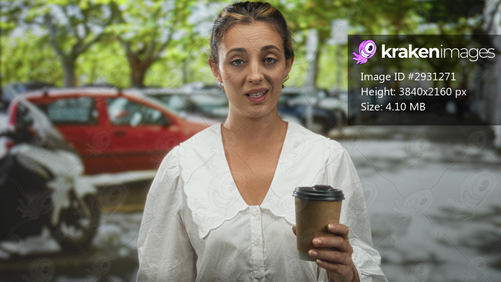 Woman holding a takeaway coffee cup with hand on chest standing on a city street among parked cars and green trees; surprise warmth.