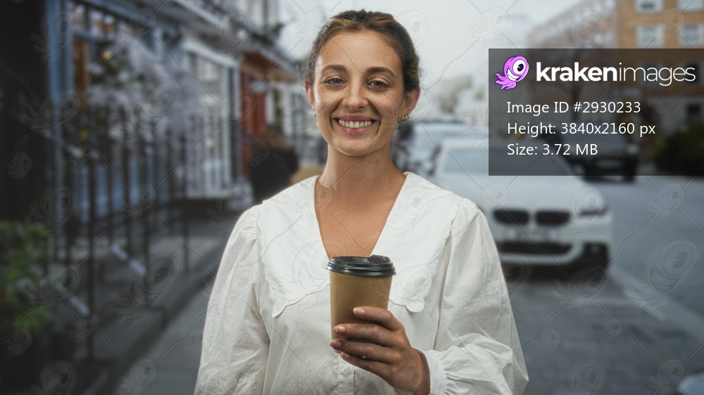Woman holding a takeaway coffee cup on a city street smiling gently in a white blouse; morning routine contentment.