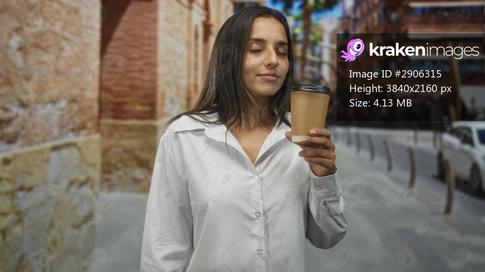 Woman holding a takeaway coffee cup, smelling it with closed eyes on a city street near a stone wall and parked car; calm contentment.
