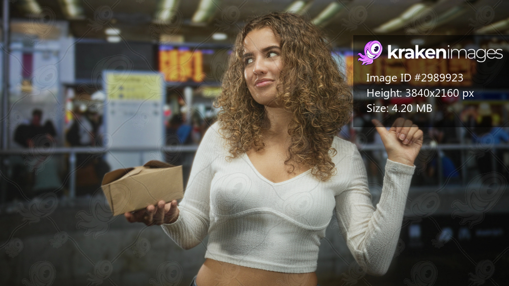 Woman holding a takeaway delivery box in left hand with bare midriff visible, right hand raised with curled finger gesture at airport terminal amid travelers; playful travel curiosity. - Kraken Images