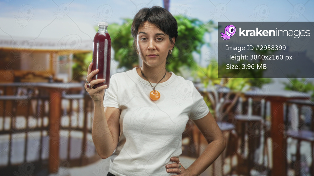 Woman holding a tall bottle of pomegranate juice up with hand and pendant visible in studio; skepticism wellness.
