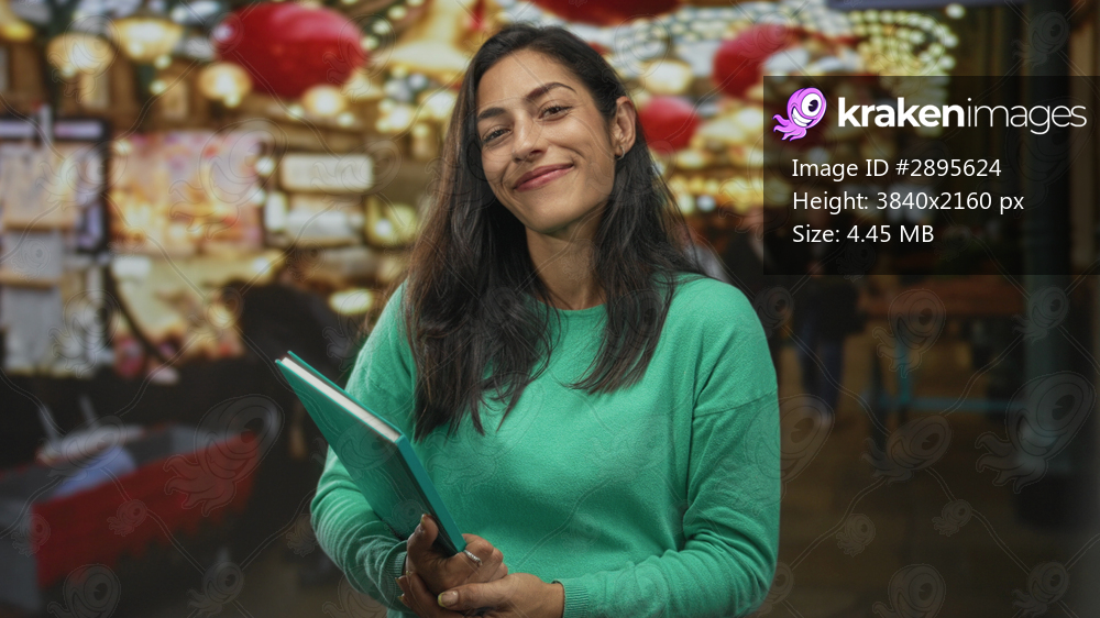 Woman holding a teal notebook and smiling, hands clasped over the book while standing near souvenir stalls under hanging lights on a busy street market; holiday contentment. - Kraken Images