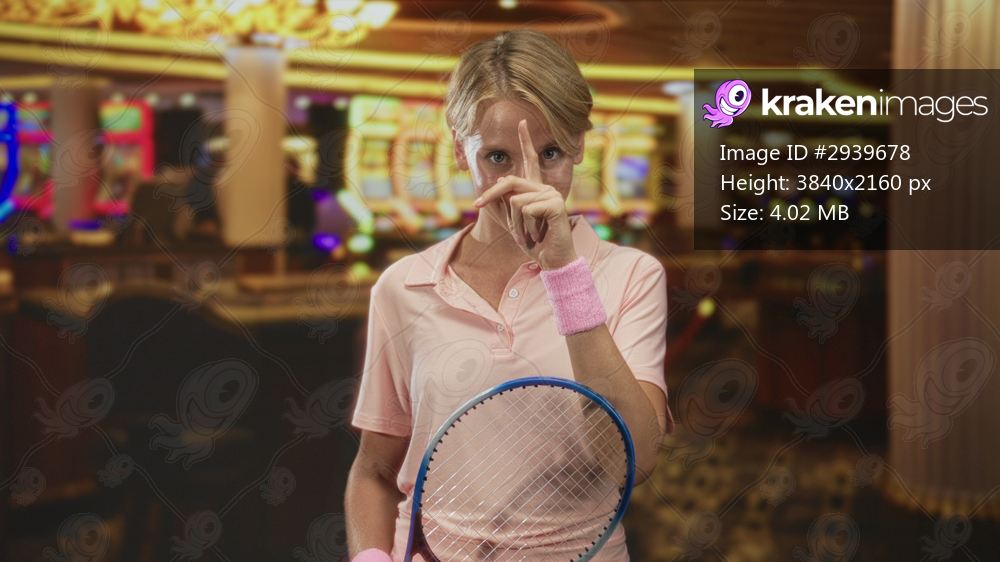 Woman holding a tennis racket points finger at camera amid slot machines in a casino building, wearing pink wristbands and polo shirt; confidence challenge. - Kraken Images
