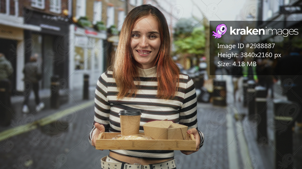 Woman holding a tray with a coffee cup and takeaway boxes, smiling while offering on a busy street; warmth hospitality.