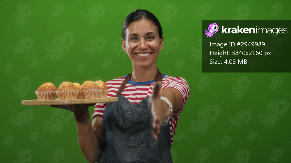 Woman holding a tray of muffins and extending hand for a handshake in green studio; friendly hospitality.