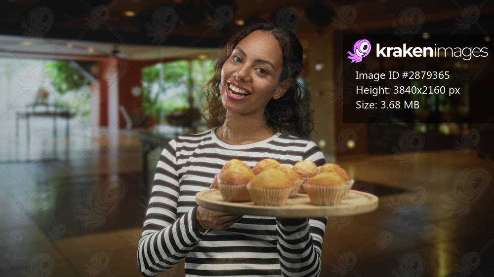 Woman holding a tray of muffins with one hand at chest level wearing a striped shirt in a building hotel interior; welcoming service hospitality.