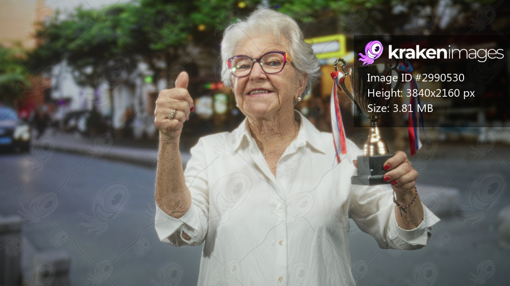 Woman holding a trophy and giving thumbs up on a busy street, visible hand and smiling face with glasses; pride joy.