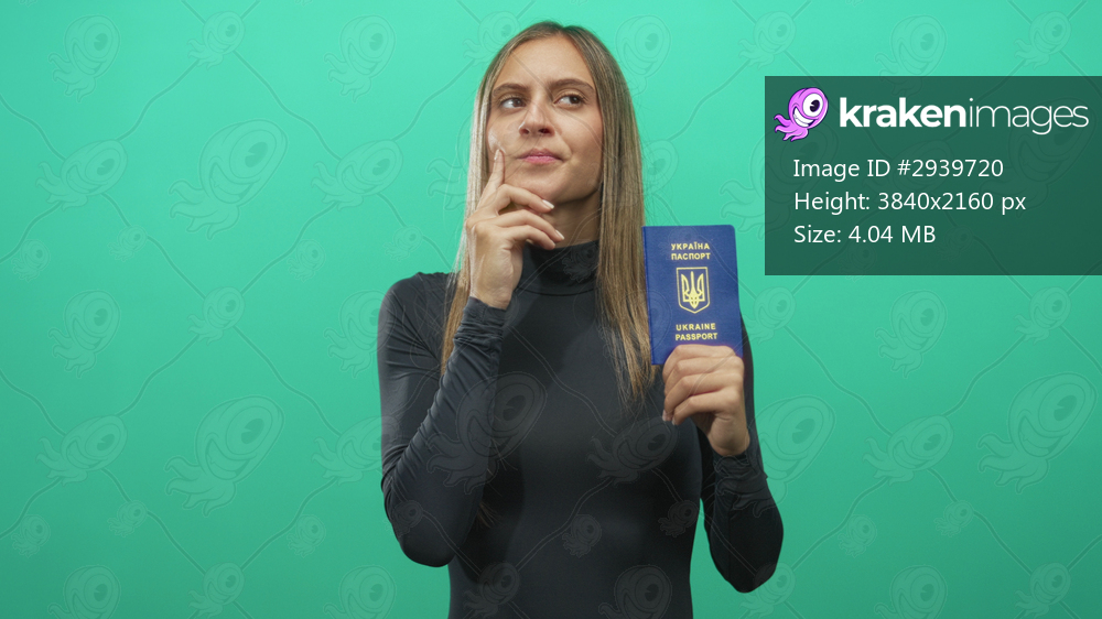 Woman holding a ukraine passport with hand on chin for thinking in a green studio set; thoughtful decision.