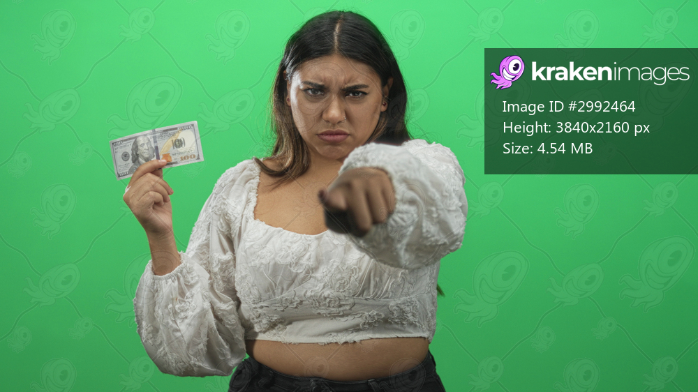 Woman holding a us banknote, points finger toward camera and pinches nose in studio green screen sequence; disgust.