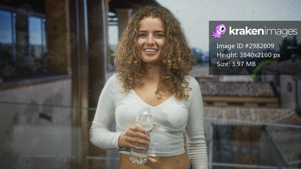Woman holding a water bottle, hands clasping plastic bottle on a building balcony with city view and subtle smile; thoughtful contemplation.