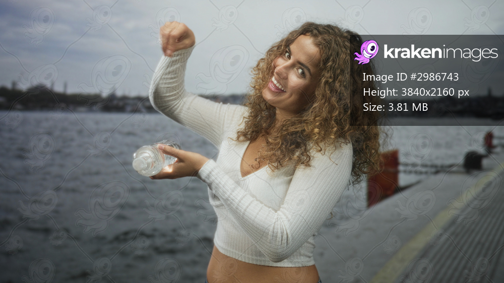 Woman holding a water bottle and pinching fingers to sprinkle water while smiling in a white knit crop top on a pier by the harbor under an overcast sky; carefree joy. - Kraken Images
