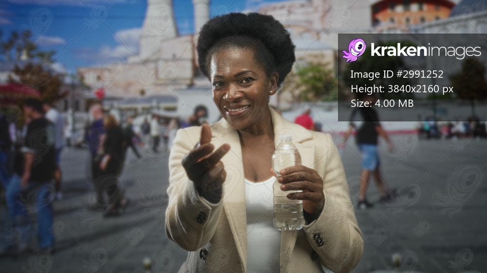 Woman holding a water bottle and pointing with hand in a busy street plaza filled with passersby and tourists; welcoming invitation.