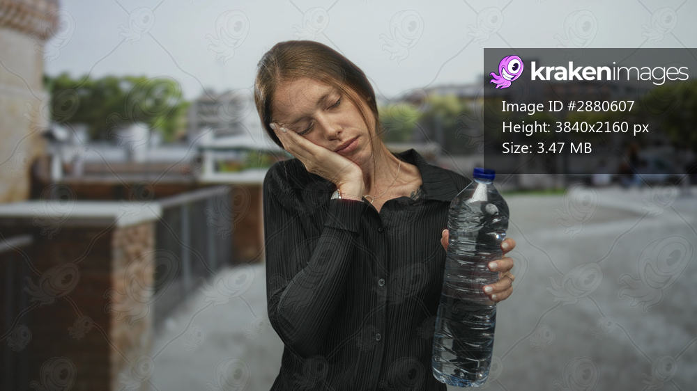 Woman holding a water bottle and resting head on hand with hand on cheek on street by a building walkway; fatigue thirst.