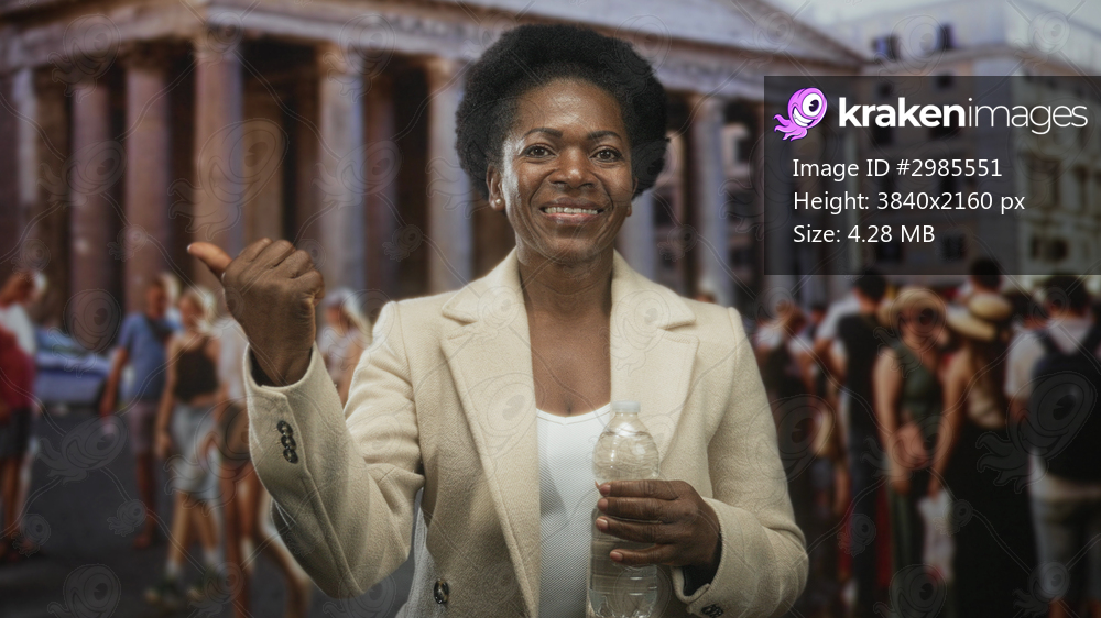 Woman holding a water bottle, thumb pointing behind toward a crowded historic street with classical columns; confidence travel.