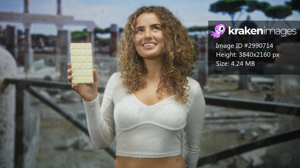 Woman holding a white chocolate bar aloft at archaeological ruins, smiling and looking upward; travel joy.