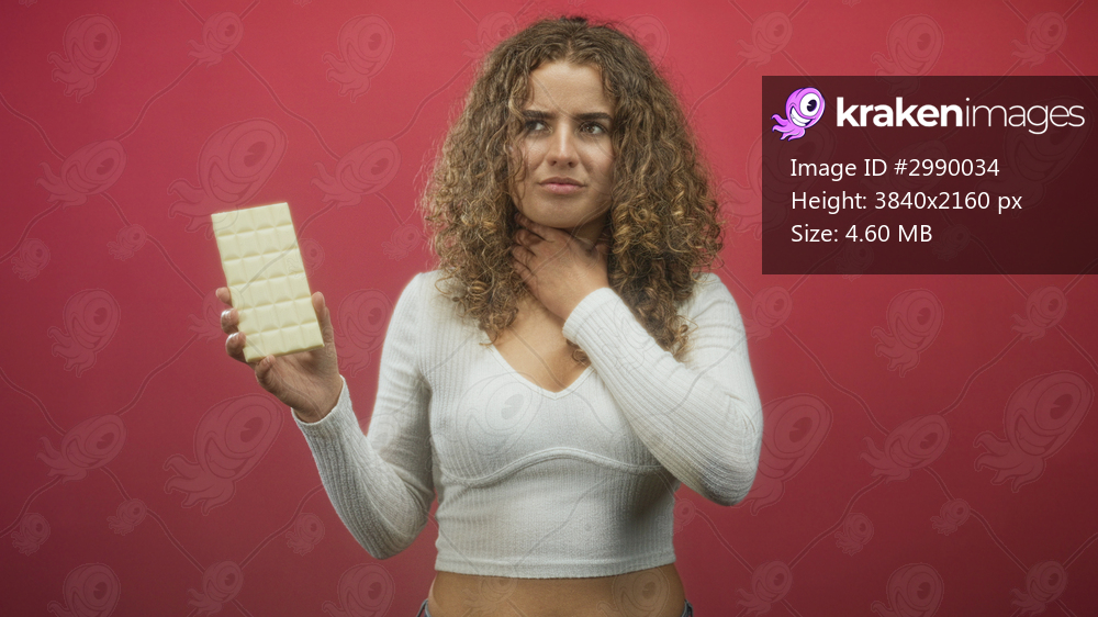 Woman holding a white chocolate bar in left hand with hand on neck and head tilted up, wearing white crop top against red wall in studio; pleasure indulgence. - Kraken Images