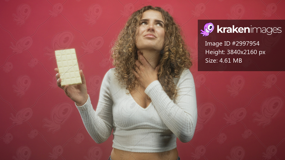 Woman holding a white chocolate bar in left hand with hand on neck and head tilted up, wearing white crop top against red wall in studio; pleasure indulgence. - Kraken Images