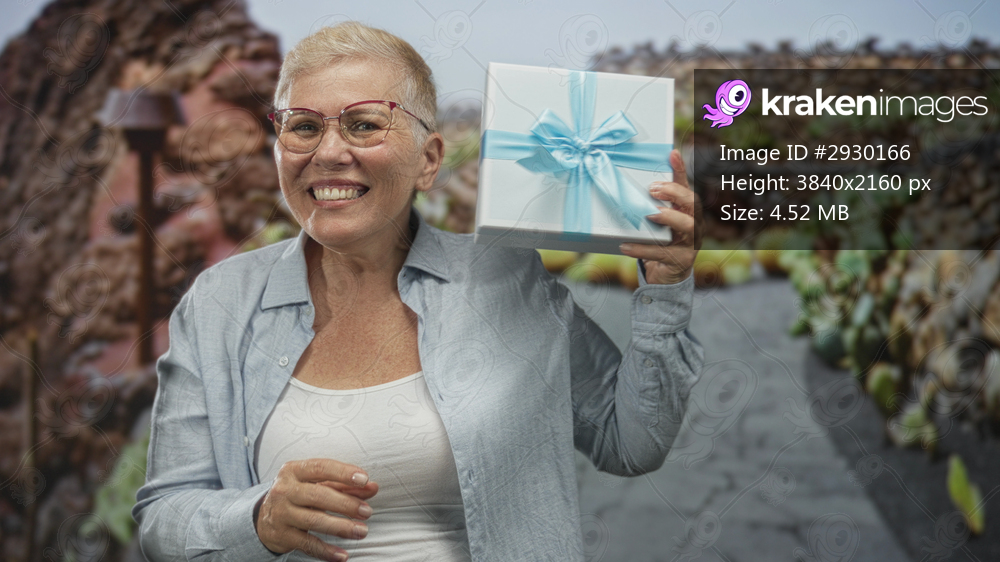 Woman holding a white gift box with blue ribbon and raised hand, smiling broadly, wearing glasses and light shirt in studio; celebration joy surprise.